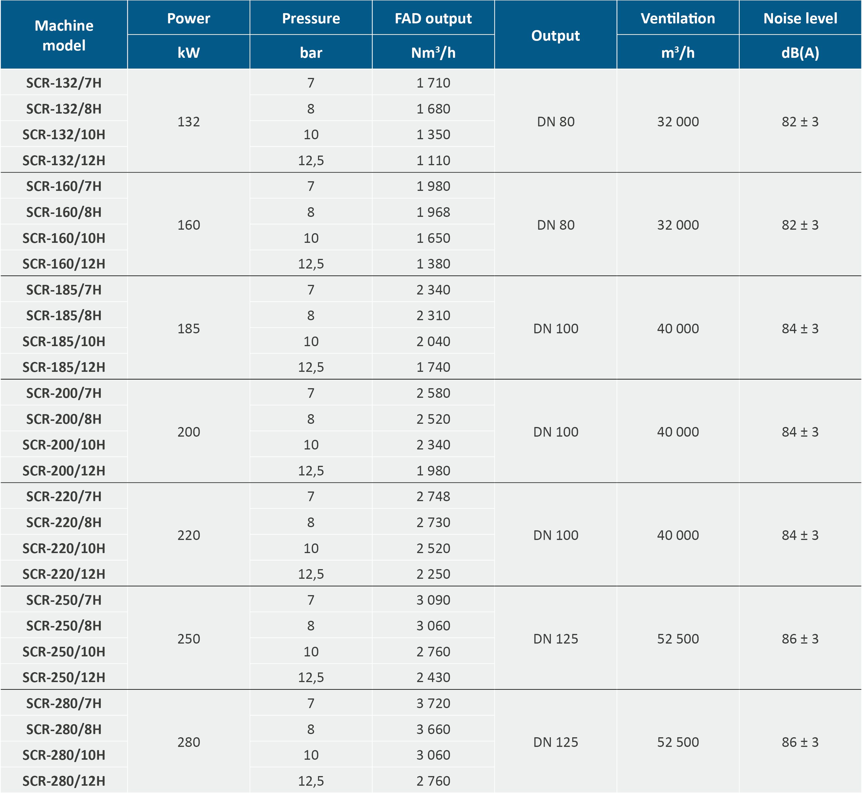 Thousands of two-stage SCR-H series screw compressors are subjected to the most rigorous testing every day in industrial and energy applications, including climatic conditions with extremely high temperatures and humidity. The SCR brand has a long history of successful projects and experience with compressor stations with a total power output of several MW.