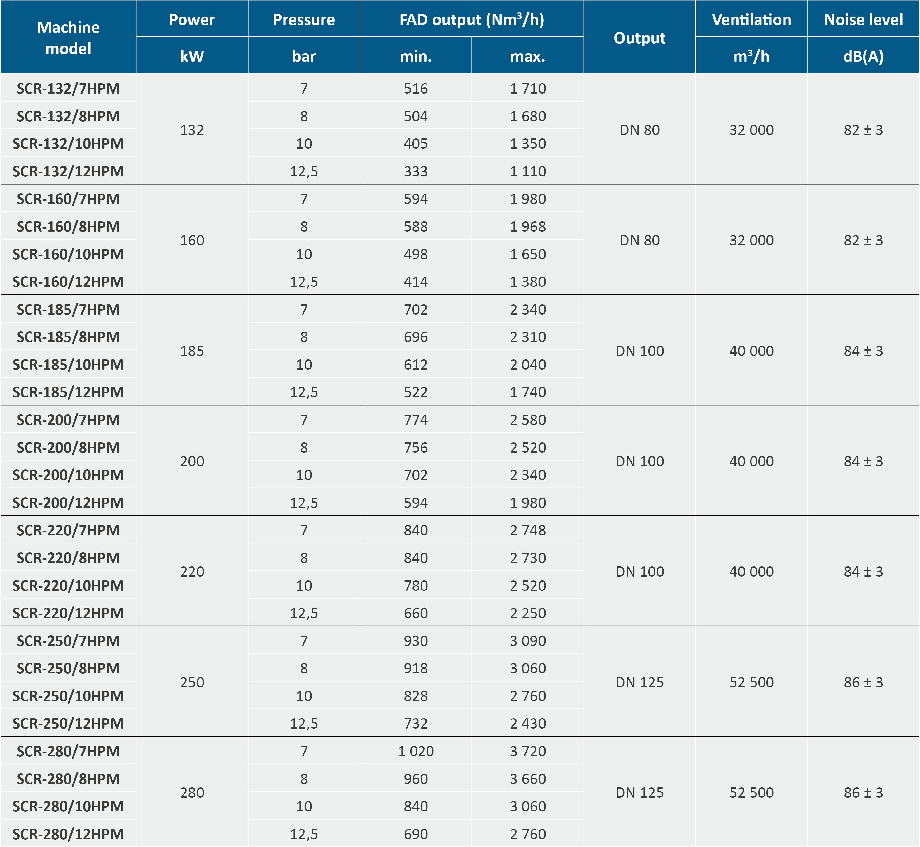 *SCR-HPM screw compressors with continuous speed control are equipped with an external frequency converter located outside the machine cabinet for outputs from 250 kW; its dimensions and weight are listed separately.