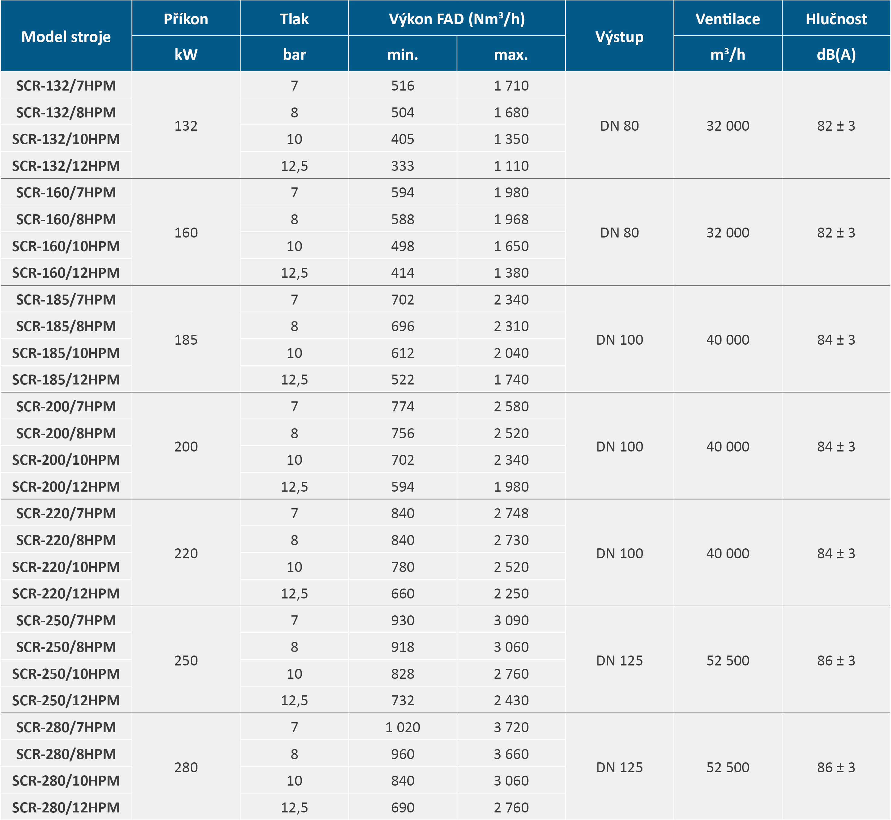 *Šroubové kompresory SCR-HPM s plynulou regulací otáček jsou v příkonech od 250 kW vybaveny externím frekvenčním měničem umístěným mimo skříň stroje; jeho rozměry a hmotnost jsou uvedeny samostatně.
